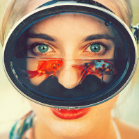 a diving mask or goggles. Through the lenses of these glasses, you can see her eyes and part of her face, with a digitally added image of two fish superimposed on the mask. The woman has a light complexion and is likely underwater due to the presence of bubbles around the mask, which is typical when