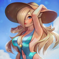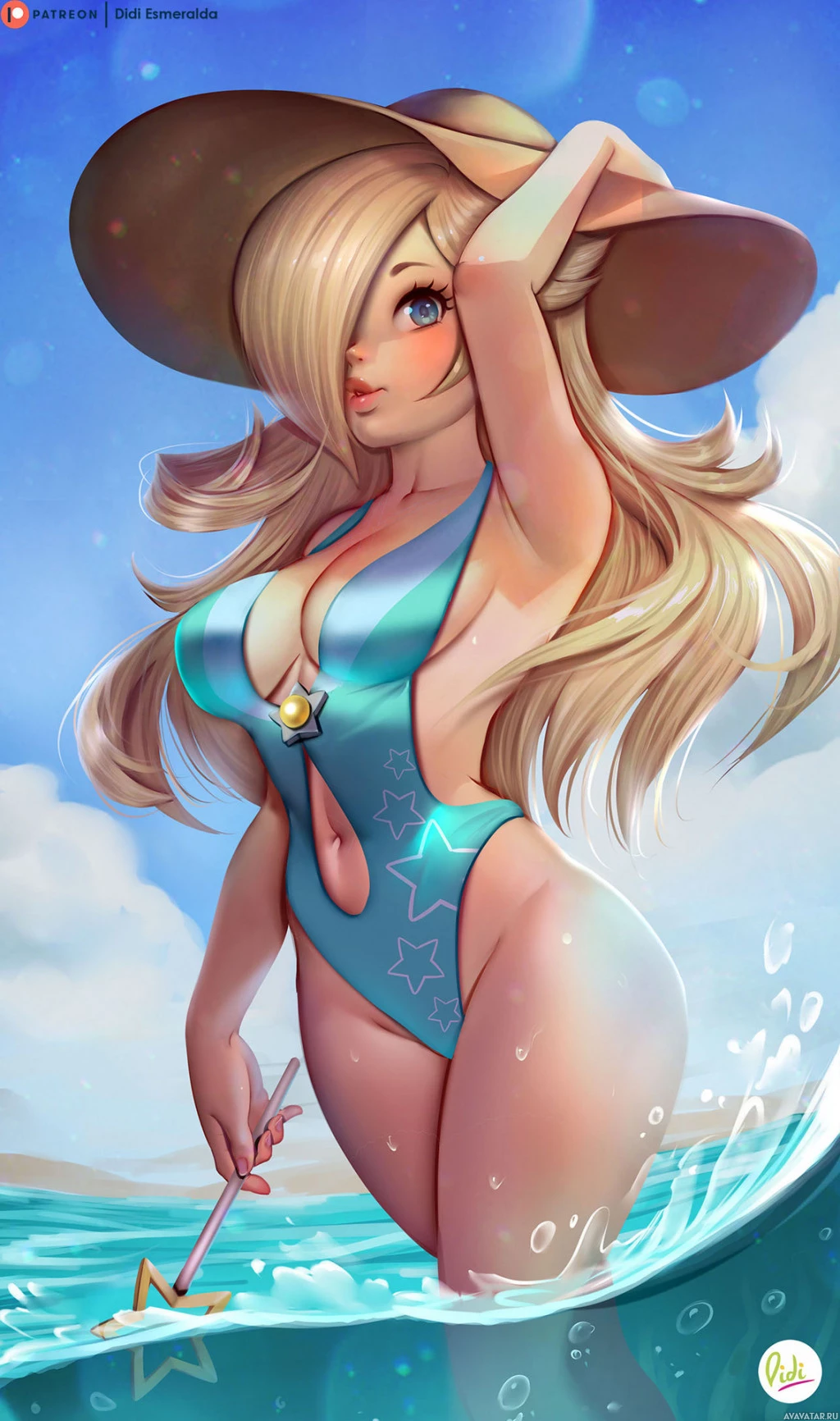 На картинке изображен анимированный персонаж, женщина со светлыми волосами в синем купальнике и соответствующей шляпе. Она, кажется, на пляже, о чем свидетельствуют волны на заднем плане. Рядом с ее ногами видны звезды.