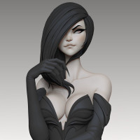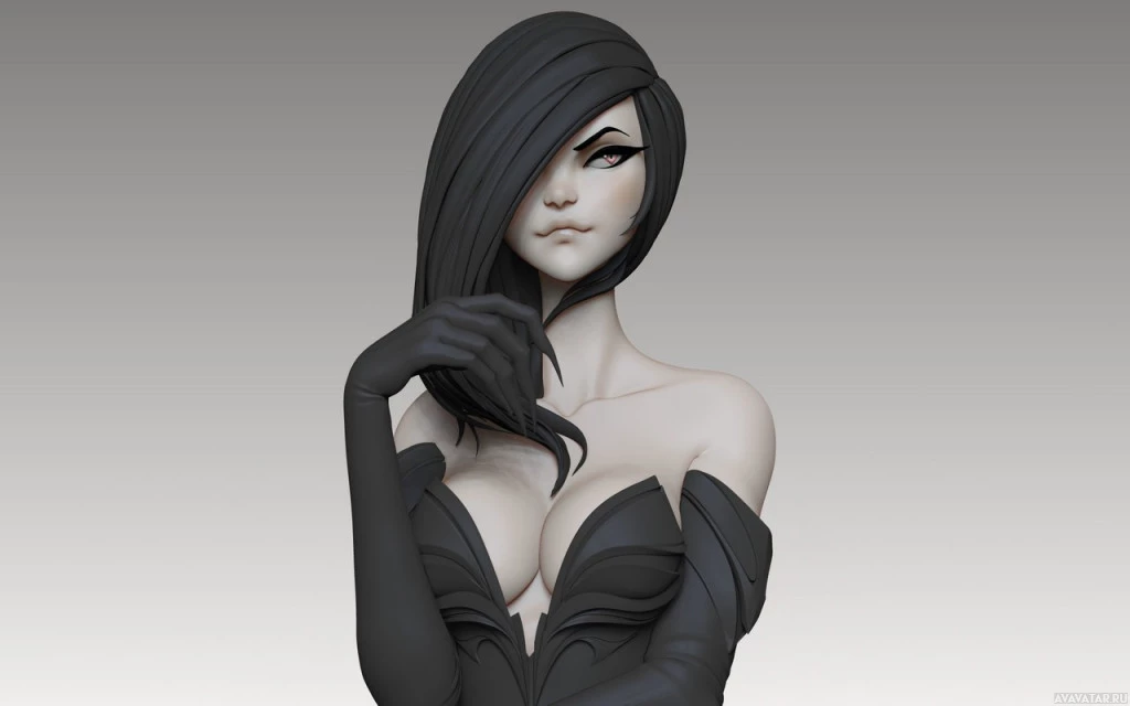 На картинке показан 3D-рендеринг женского персонажа с волосами брюнетки. Она носит черно-серый наряд, который можно интерпретировать как костюм или модный наряд. Персонаж имеет уверенное выражение лица.