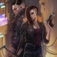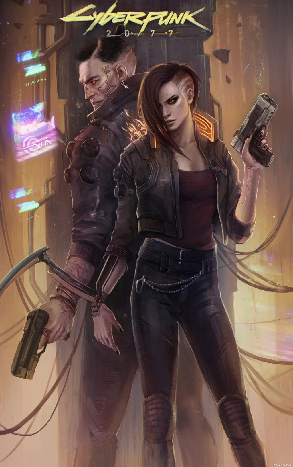 the video game "Cyberpunk 2077." The characters are depicted in a stylized,