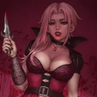 pink hair, wearing lingerie and holding what appears to be a knife. She has a vampire-like appearance, with dark eyes and is set against