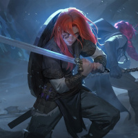 the first character, potentially in combat or an intense encounter. They are both depicted in what looks like a fantasy setting, possibly suggesting they are part of