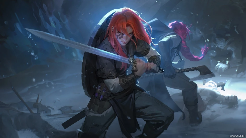 The image shows two characters, one of whom is holding a sword and appears to be female with