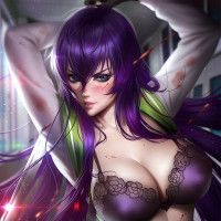 female character with purple hair. She has a fantasy-themed outfit that appears to be torn and bloodied, suggesting she may have been involved in a battle or conflict. The background suggests