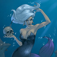The image features a character that resembles a mermaid, holding what appears to be a skull. She has long