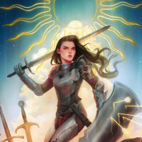 head with horns, which could imply she is in a battle against these creatures. The artwork has a fantasy theme and