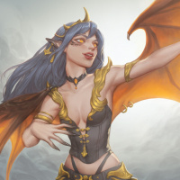 blue hair and horns, with wings spread out as if in flight or preparing for flight. She's wearing an ornate costume with