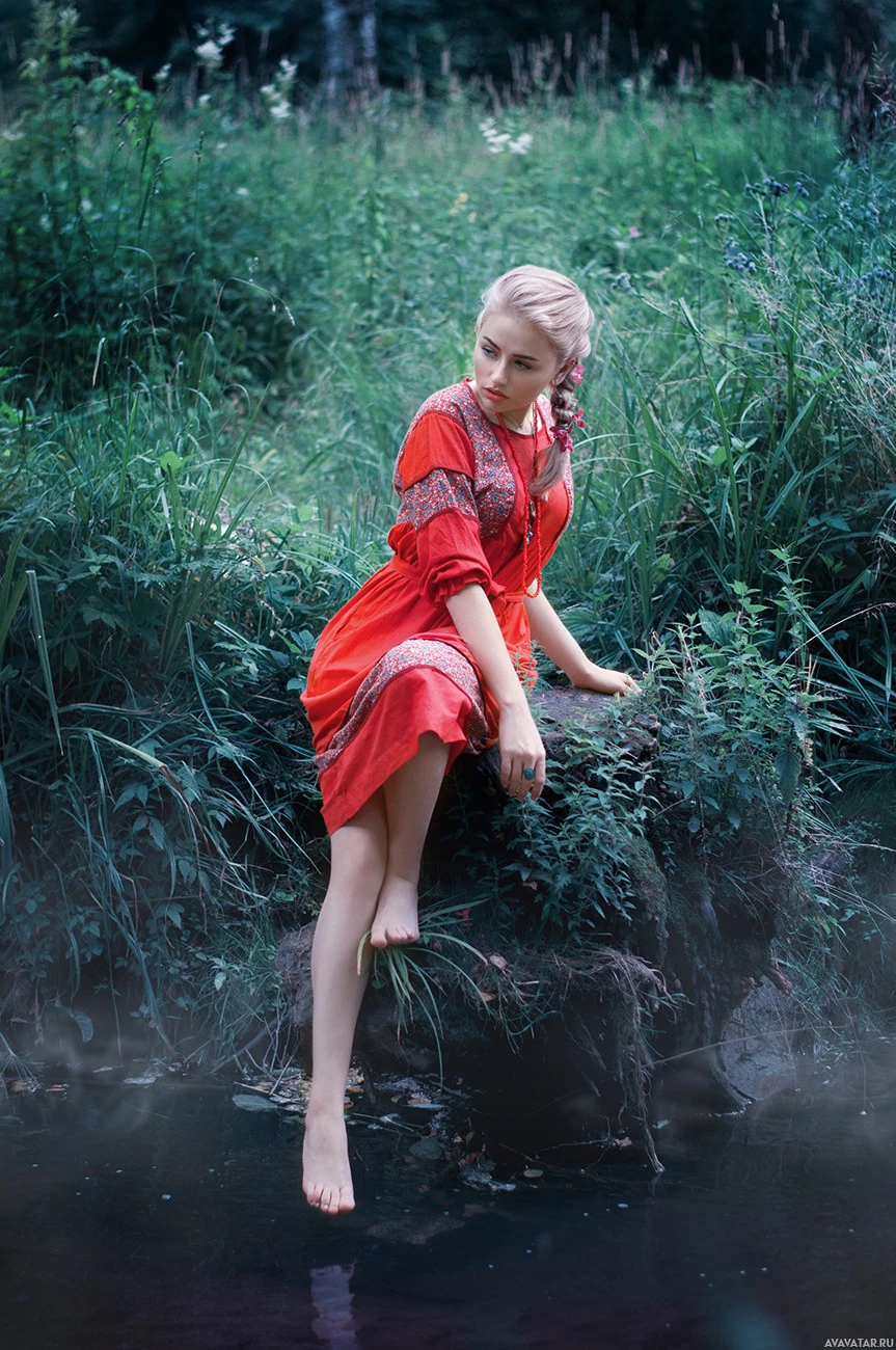 The picture features a woman sitting on a rock with her bare feet in the water. She is wearing a red dress and has blonde hair. Her body language suggests she is relaxed or contemplative as she sits near the stream.