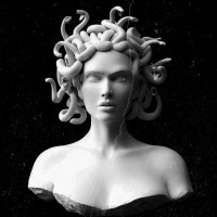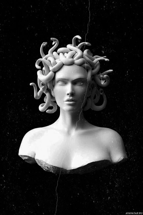 ancient mythology. She is depicted with snake-like hair and