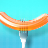 The image shows a playful and surreal arrangement. There is an orange-colored banana that appears to be floating or balancing on a white fork. This