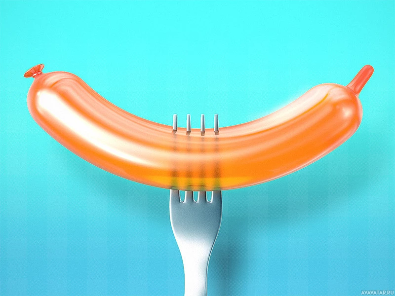 hot dogs hanging from the banana's ends, suggesting that they might be "floating" due to the air inside them. The background is a plain, light blue surface which contrasts with