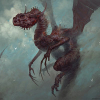 a dynamic pose as if it's either taking flight or moving through the air. The background is cloudy and dark, which suggests an ominous or mystical atmosphere. This image falls under the category of fantasy artwork due to its imaginative and non-realistic portrayal of