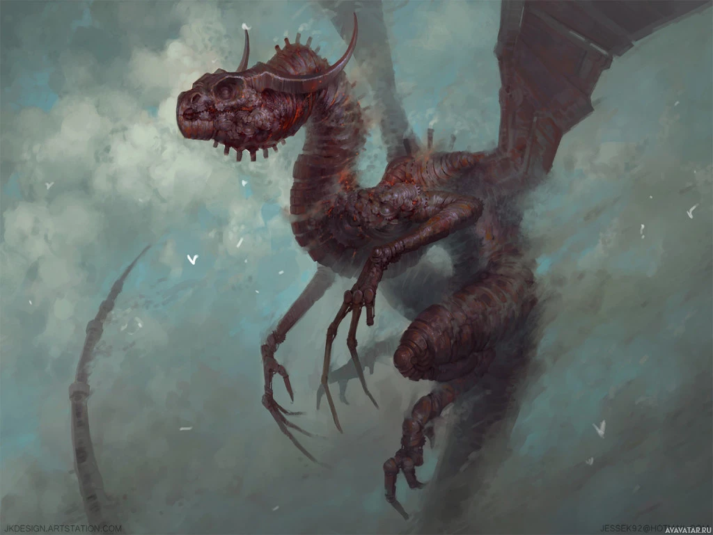 body structure with the wings and head of a traditional dragon, complete with horns and eyes. The creature is shown in