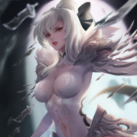 a bow tie. The setting seems to be at night or in the dark, as suggested by the moon and the shadows around her. There's also an element of action, indicated by
