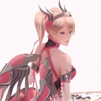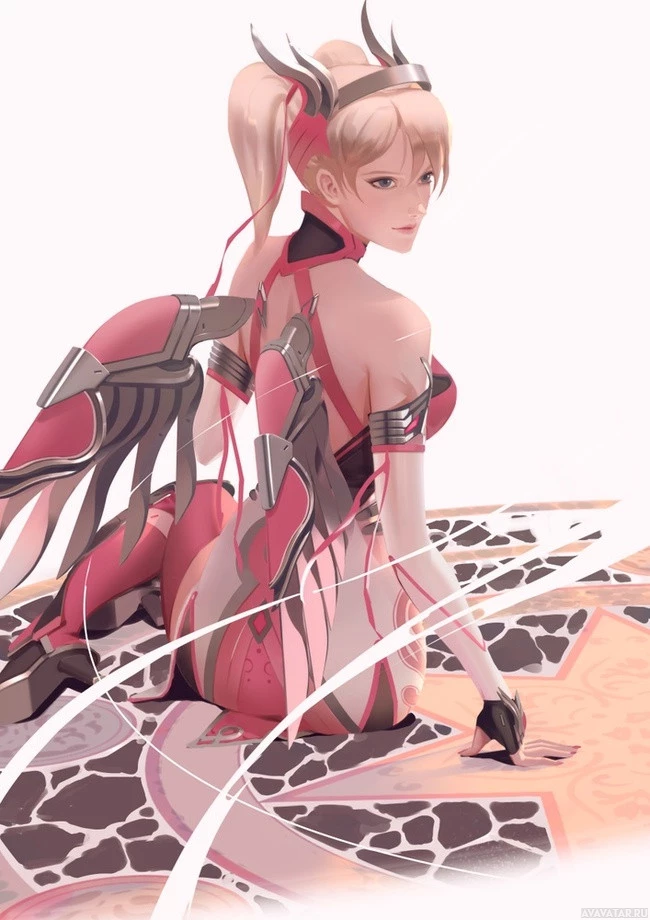 the video game "Overwatch." The character depicted is Mercy, recognizable by her pink and white outfit with wings and a staff. She appears to be in