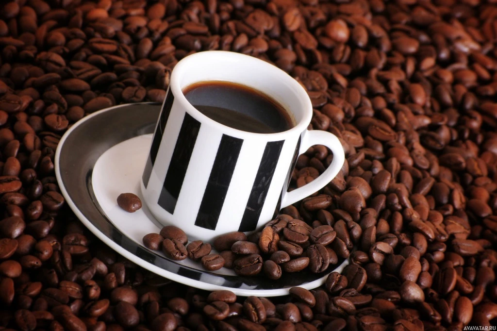 На рисунке изображена чашка кофе, поставленная на блюдце, окруженное целыми кофейными зернами. Чашка и блюдце украшены черно-белым клетчатым рисунком.