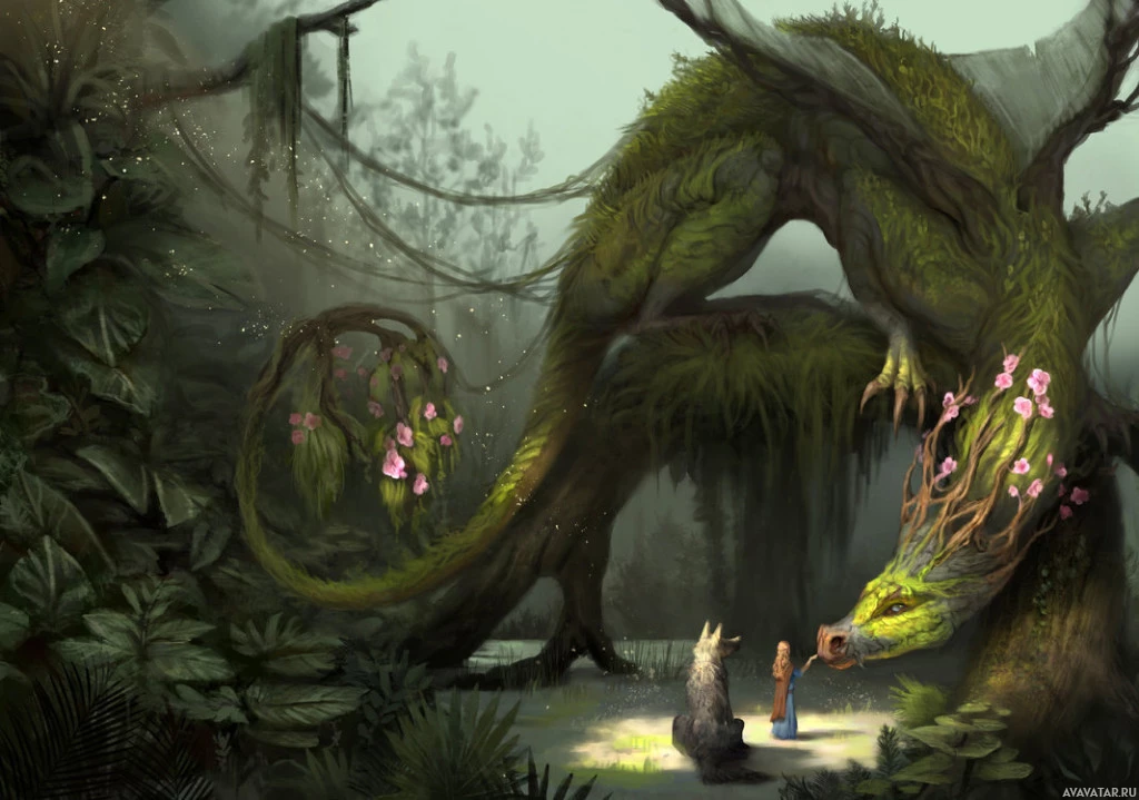 a fantastical scene with a dragon. The dragon is green and has