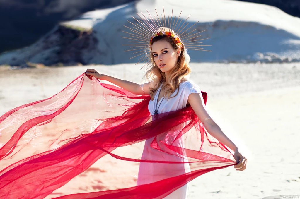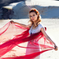 a floral crown or headpiece that adds a bohemian or mythical touch to her appearance. The fabric she's holding or draping over one arm seems to be flowing and vibrant, suggesting a silky or satiny texture in