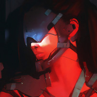 The image appears to be a digitally altered or artistic representation of a person, likely a woman, with a futuristic or cyberpunk theme. The image is fragmented and blends