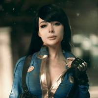 На картинке изображен персонаж из видеоигры «Fallout 4». Она носит синий и золотой костюм с значком на груди, который напоминает культовую доспех. У персонажа длинные темные волосы и серьёзное выражение лица.