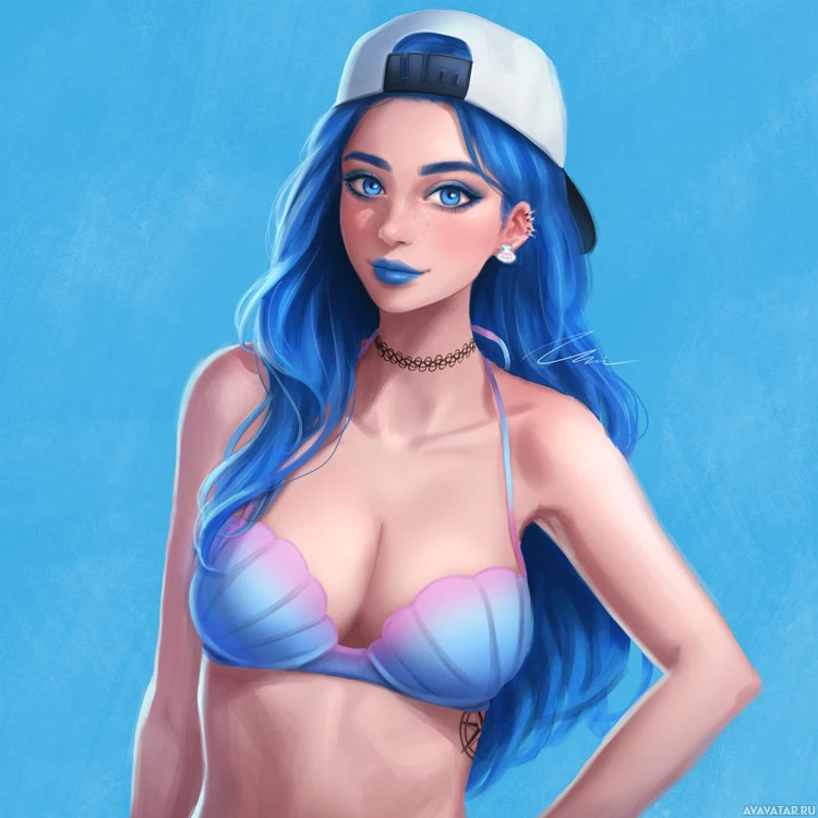 a young woman with blue hair, wearing a pink and white bikini with a cute face, possibly with a stylized design. She is also wearing a white cap with a blue emblem on it, which could imply she is at the beach or enjoying