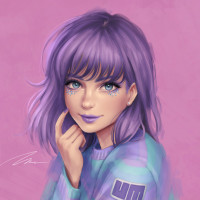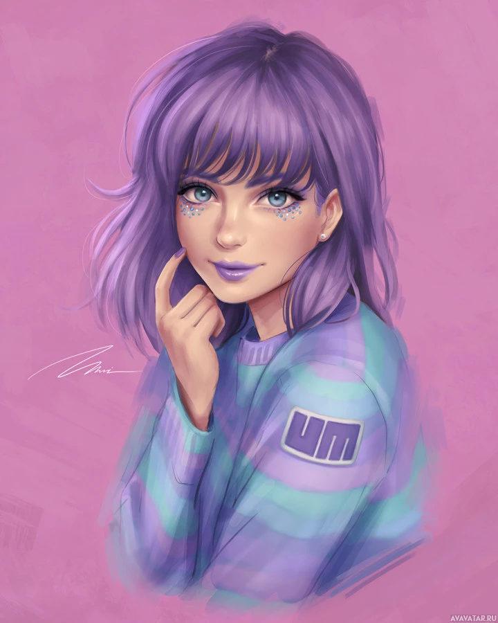 purple hair. She is looking directly at the viewer and has