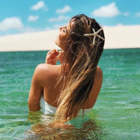 In the picture, there is a woman standing in the ocean with her back towards the camera. She appears to be looking up at the sky or at something above her. The water around her suggests that she might be wading in