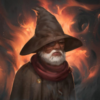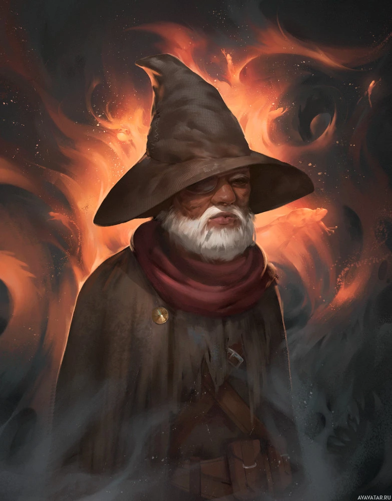 white beard, suggesting they are experienced or wise. They are standing against a background that includes flames and smoke, which might indicate some form of