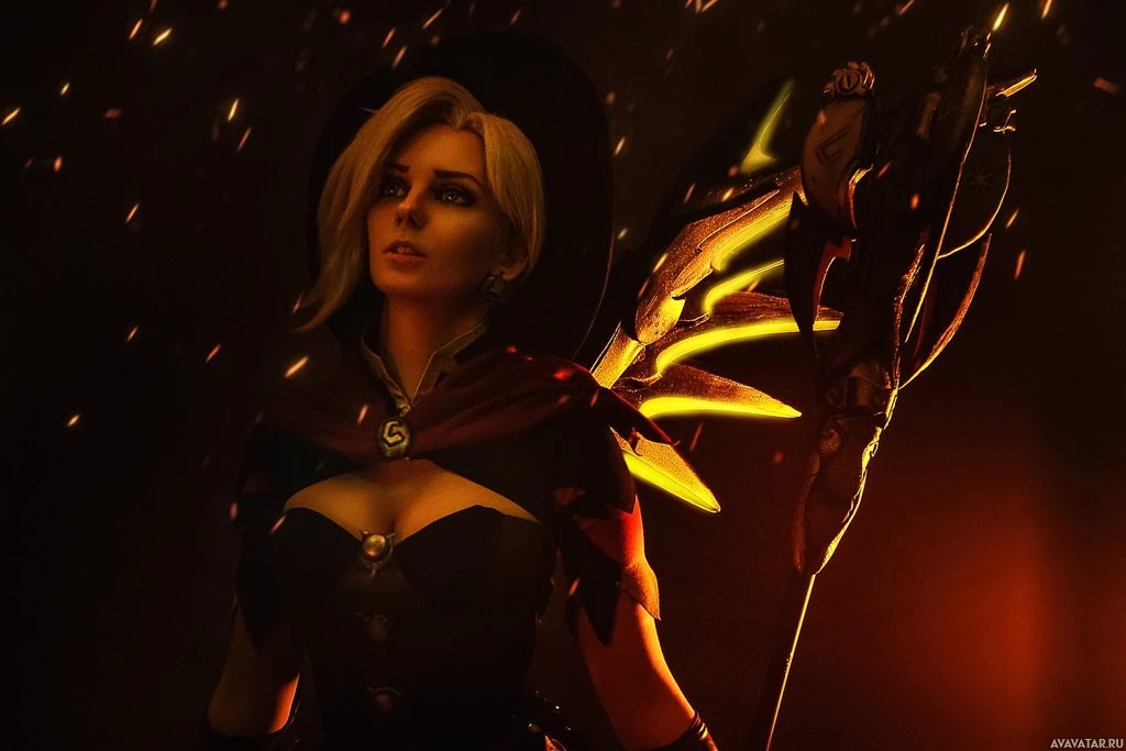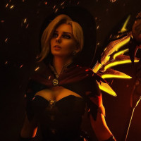 The image depicts a character from the video game "Overwatch." She is wearing a costume that resembles Mercy, a support hero in the game. The character is shown with fiery elements around her, suggesting a powerful ability or a dramatic portrayal.