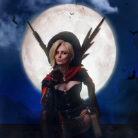 a full moon above. The character is dressed in fantasy-inspired armor and is holding a staff. The setting and lighting give the image a dramatic, almost otherworldly feel that aligns with her