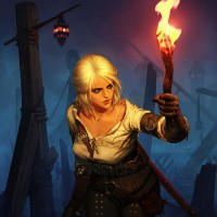 eerie environment, possibly a battlefield or a desolate area. Ciri is holding two torches, which could suggest she's searching for something or preparing for combat. She is wearing armor with visible straps and buckles, indicating it's battle-