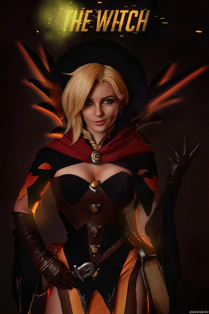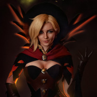 The image features a character from the game "Overwatch," who is known as Mercy. She is depicted in her cosplay attire, which includes a cape with a skull and wings, gothic-style clothing, and a staff. The character is well-known for her healing abilities within the game.