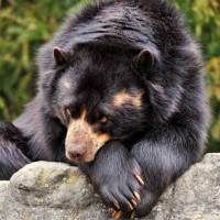 На картинке медведь сидит на каменной стене или выступе. Поза медведя предполагает, что он может отдыхать или наблюдать за своим окружением. На заднем плане видны некоторые деревья, что указывает на то, что эта сцена может происходить в естественной среде или в парке дикой природы.