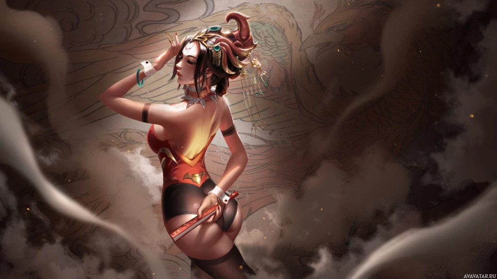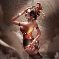 a dynamic pose, with her right arm raised and her left hand resting on her hip. Her outfit is distinctive, combining elements of traditional