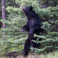 The picture features a black bear in a forested area. The bear is standing upright and appears to be interacting with the foliage, possibly climbing or playing within the trees.