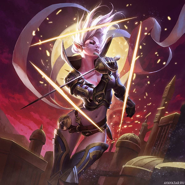 white hair and is wearing armor that suggests she is ready for battle or adventure. In one hand, she is holding a sword, which complements the action pose she appears to be in. Her other hand is extended as if reaching for something or casting a spell. The background indicates an urban fantasy setting with silhouetted buildings and what seems to be magical effects such as