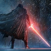 Kylo Ren is wearing his signature black cape and wielding a red lightsaber. His expression is serious as he gazes into the distance, embodying the intensity often associated with his character in the Star Wars movies.