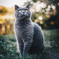 a gray cat sitting in what appears to be a garden setting. The cat is looking directly at the camera with a focused expression, and there's