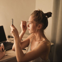 The image shows a woman at a desk, seemingly in the process of applying makeup. She is looking into a mirror with a focus on her face, and it appears to be nighttime or early morning given the darkness outside the window. On the desk, there are various items including a laptop, papers, a handbag,