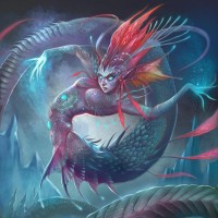 vibrant colors in its scales and hair, giving it an ethereal and otherworldly appearance. It's surrounded by dark,