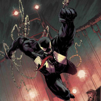The image depicts a comic book illustration of the character known as Venom. Venom is a fictional supervillain appearing in American
