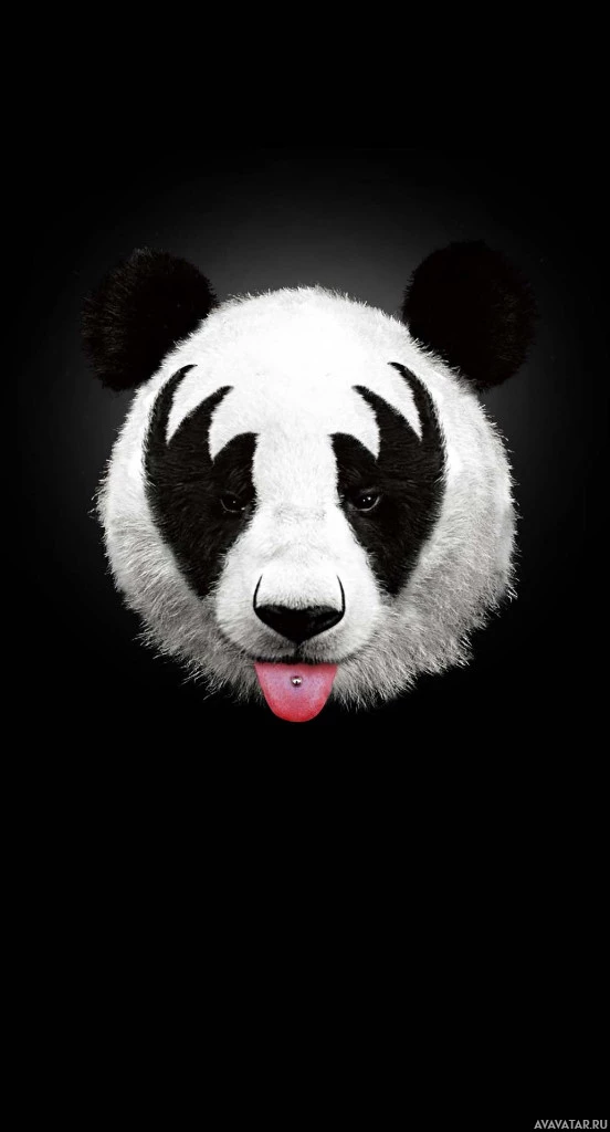 The image shows a panda wearing what appears to be a rock and roll band outfit, with black and white stripes resembling the band Kiss's