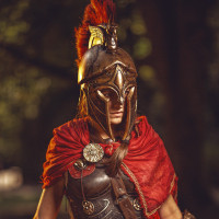 Roman armor and accessories, which include a sword and shield. The attire is detailed, with elements that resemble