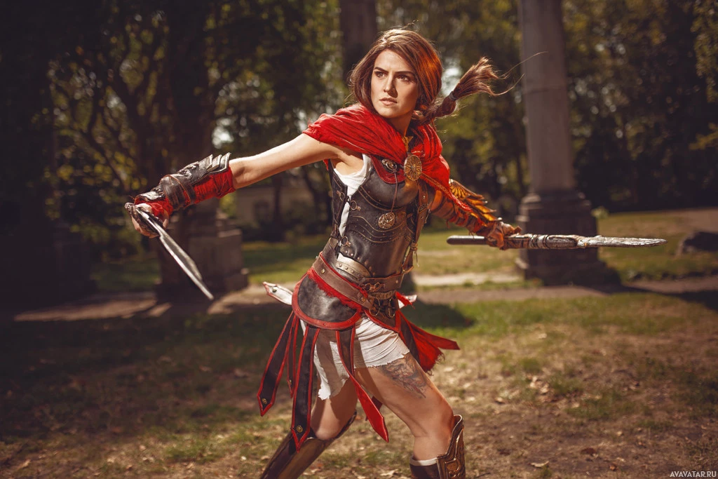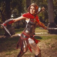 Creed series. The individual is wearing a costume that includes elements associated with the game, such as armor and weapons resembling those used by characters in the Assassin's