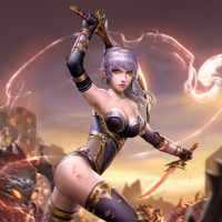 an animated character, a girl with purple hair and a fantasy-themed costume. She is holding a sword in her right hand, which she is wielding skillfully. There's