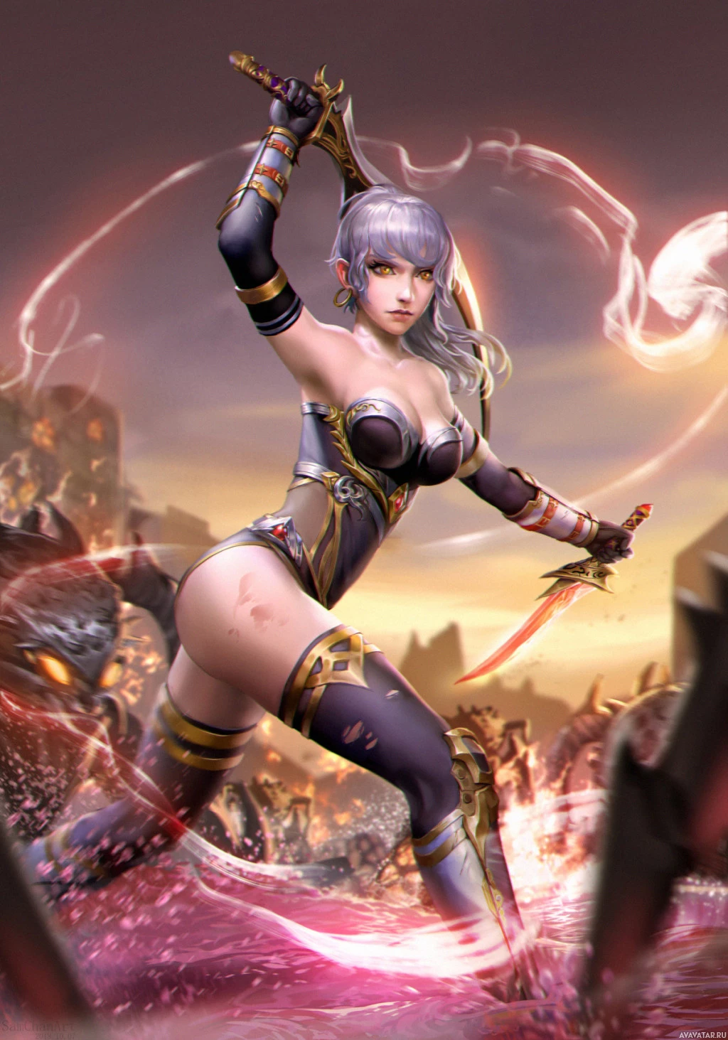 a magical energy or power emanating from the sword, suggesting she might be casting a spell or using it for combat purposes. The background features an intense