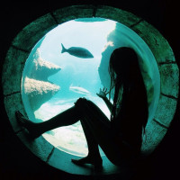 The picture shows a silhouette of a girl sitting with her legs outstretched, appearing to be looking at fish through a glass window that is part of an underwater viewing area. There are multiple fish visible in the water beneath her gaze.