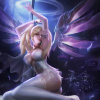 a character from the game "Overwatch," known as Mercy. She is styled in an angelic or demonic appearance, complete with wings and horns. She's shown crouching on what appears to be