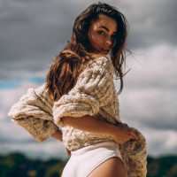 long hair that seems to be blowing in the wind due to her pose. There is water behind her, suggesting an ocean or sea setting. She is looking over her shoulder, away from the camera, which gives a sense of her profile. The lighting suggests it might be late afternoon or early evening, given the softness of the shadows and
