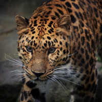 На снимке показан леопард, отличающийся характерным узором шерсти темных пятен на более светлом меху. По-видимому, он находится в дикой природе или, возможно, в защищенной среде, как предполагает фон, который выглядит как скалистая местность.